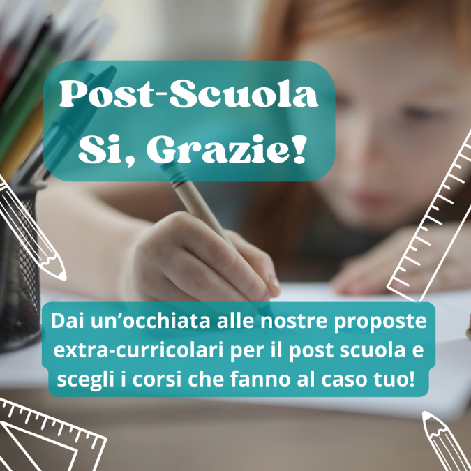 Per noi è importante organizzare i corsi al meglio, per questo motivo ti chiediamo, già da adesso, di indicarci a quali saresti interessato per tuo figlio/tua figlia, e di esprimere le tue preferenze, che al momento non sono vincolanti, compilando il form che trovi al seguente link => CORSI POST-SCUOLA.